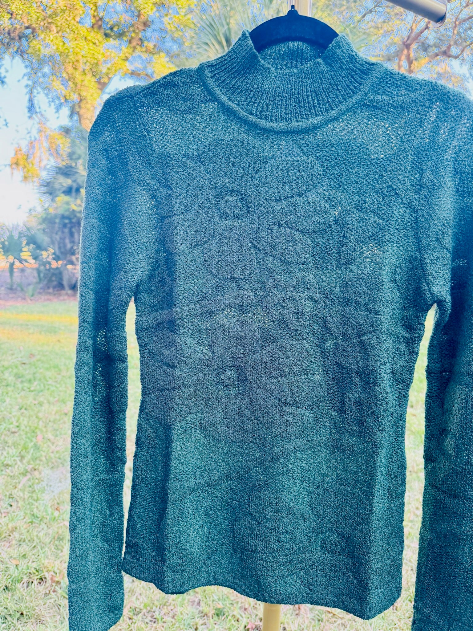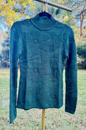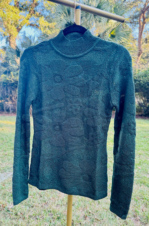 Elevate your layering game with this stunning floral jacquard textured mock neck sweater top in a rich hunter green. The Annie is designed with intricate floral jacquard detailing that brings a romantic, elevated touch to any outfit. The fitted silhouette hugs the body just right, while the mock neck and long sleeves add a touch of sophistication. This top is perfect for pairing with high-waisted trousers, skirts, or layered under a tailored jacket for a bold, feminine edge.