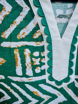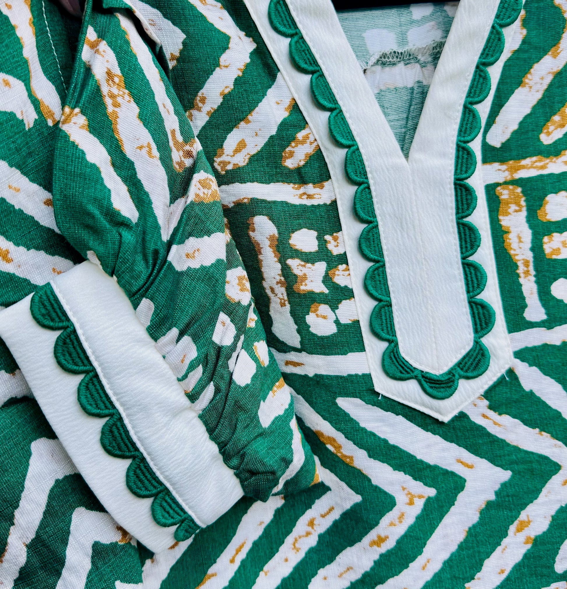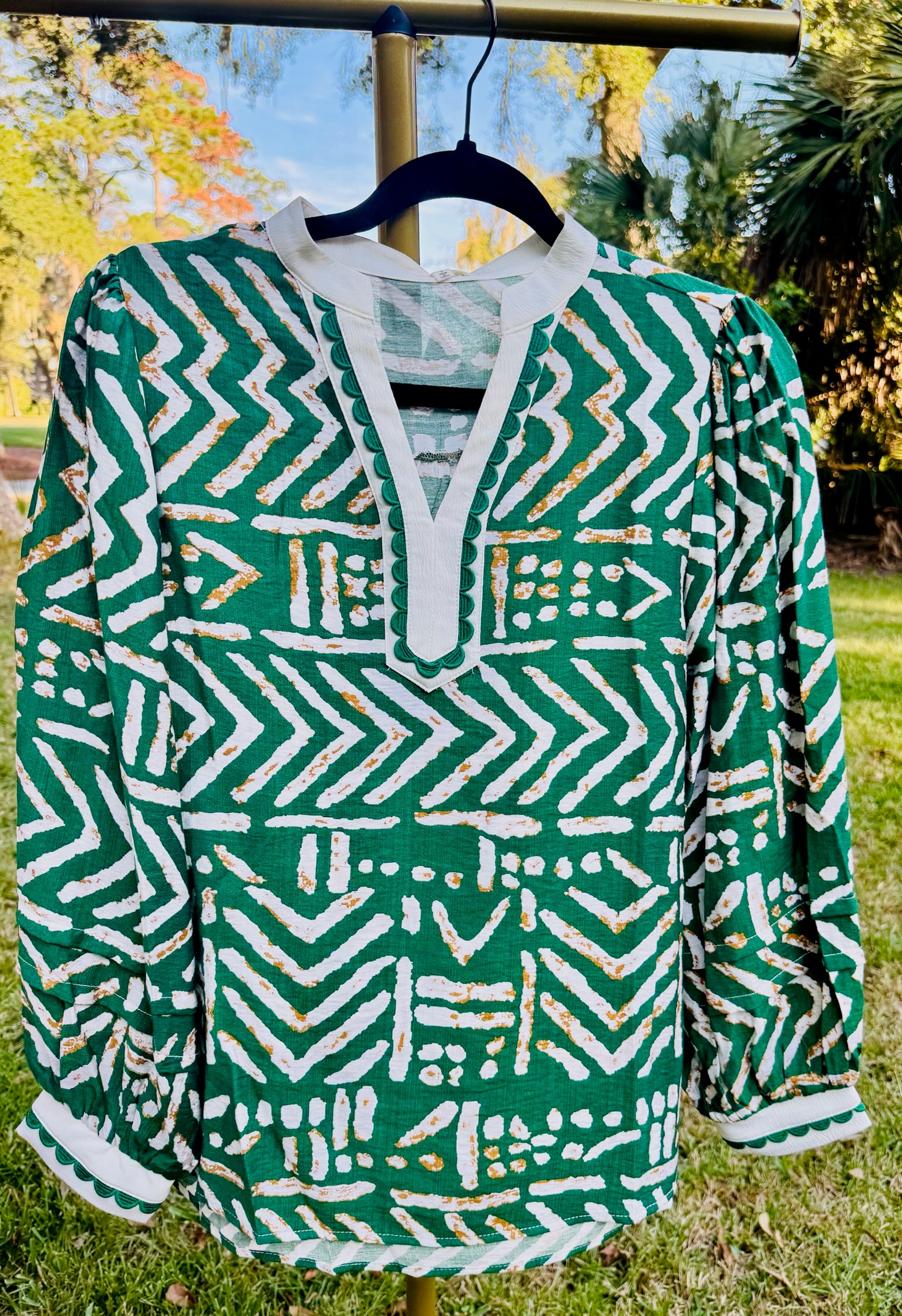 Bold meets beautiful in the Ashton! Featuring a vibrant tribal print in rich shades of green that instantly elevate your wardrobe, this top is thoughtfully finished with delicate scallop tape trim for subtle, elegant detail. Perfect for pairing with your favorite jeans or a sleek skirt, the Ashton brings effortless style and unique flair to any outfit.