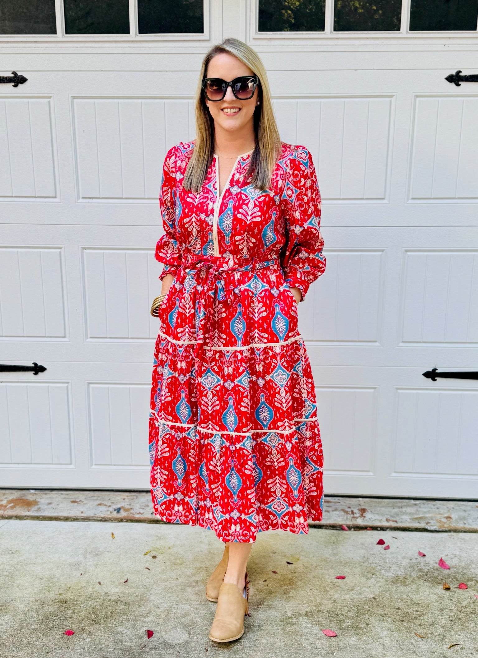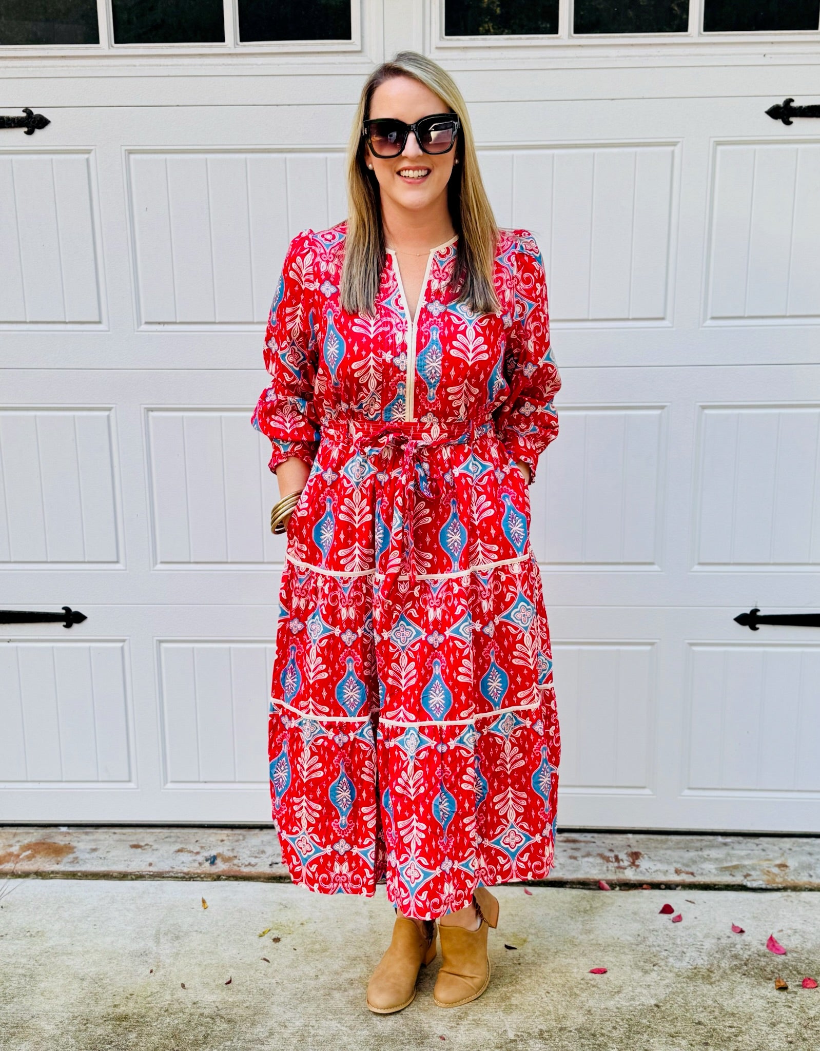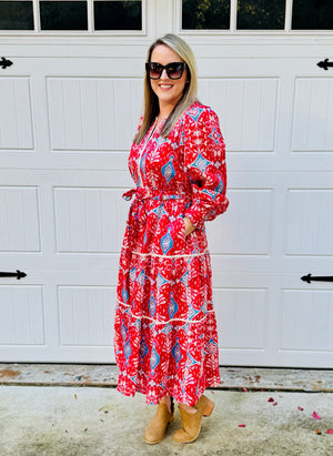 Turn heads in this effortlessly elegant midi dress, featuring a bold red and blue print that brings a vibrant edge to any wardrobe. The Camille features a notched V-neckline, framed with contrast binding and subtle seam detailing. Long puff sleeves end in ruffled button cuffs, lending a touch of romantic drama, while the fitted waist is carefully tailored with seam accents to flatter your figure. Perfect for both day events and evening occasions, this dress blends timeless femininity with contemporary flair.