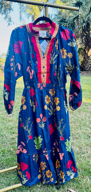Romantic, effortless, and full of charm — the Gabriella is your go-to dress for a polished yet playful look. Featuring a beautifully ruffled neckline and long sleeves, this dress brings a touch of elegance to every step. Designed in a deep navy base with a vibrant mix floral print, this midi dress is perfect for brunches, parties, or a casual date night. Pair it with ankle boots or strappy heels to complete the look.