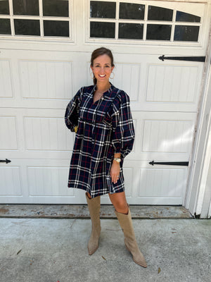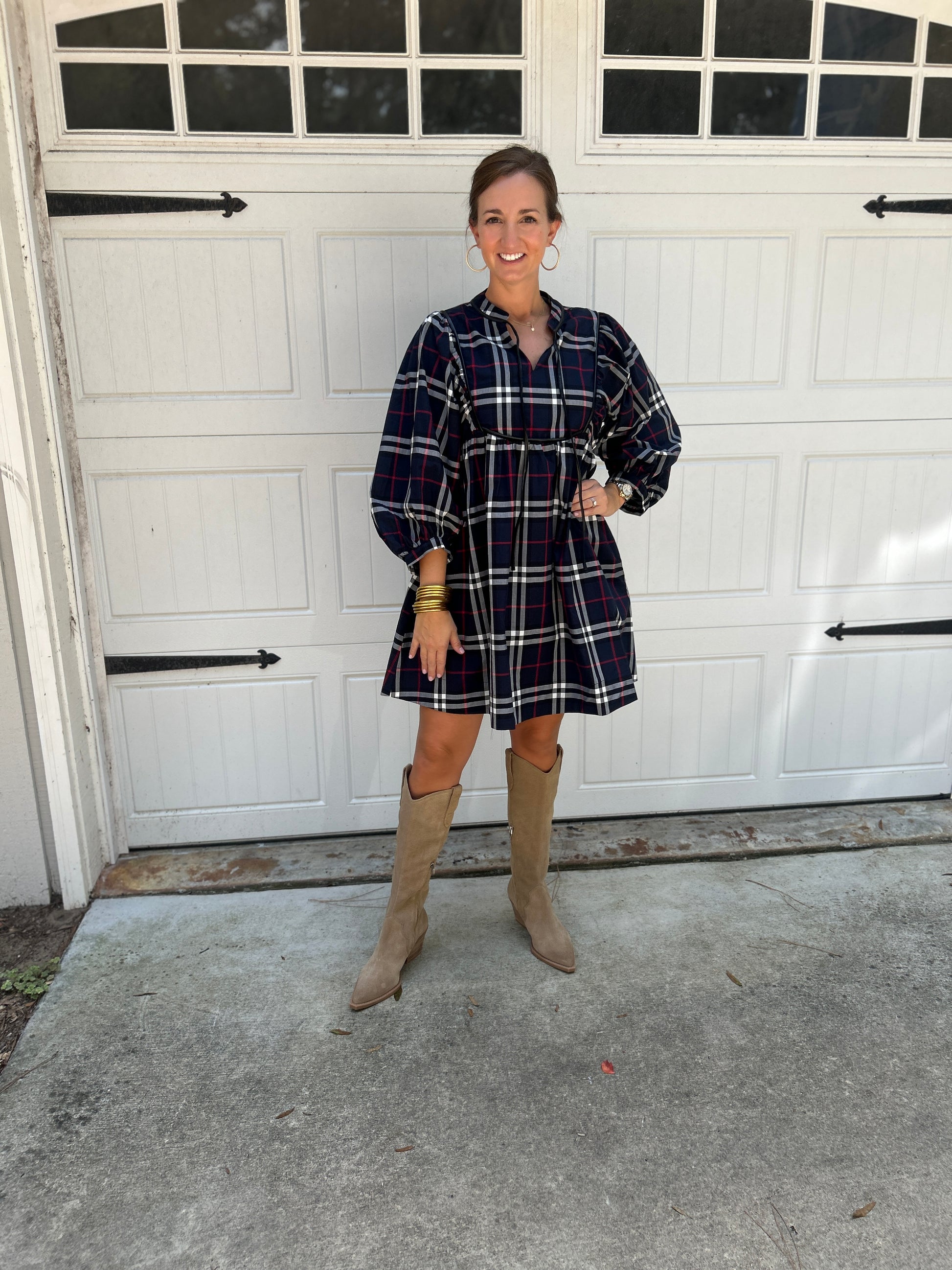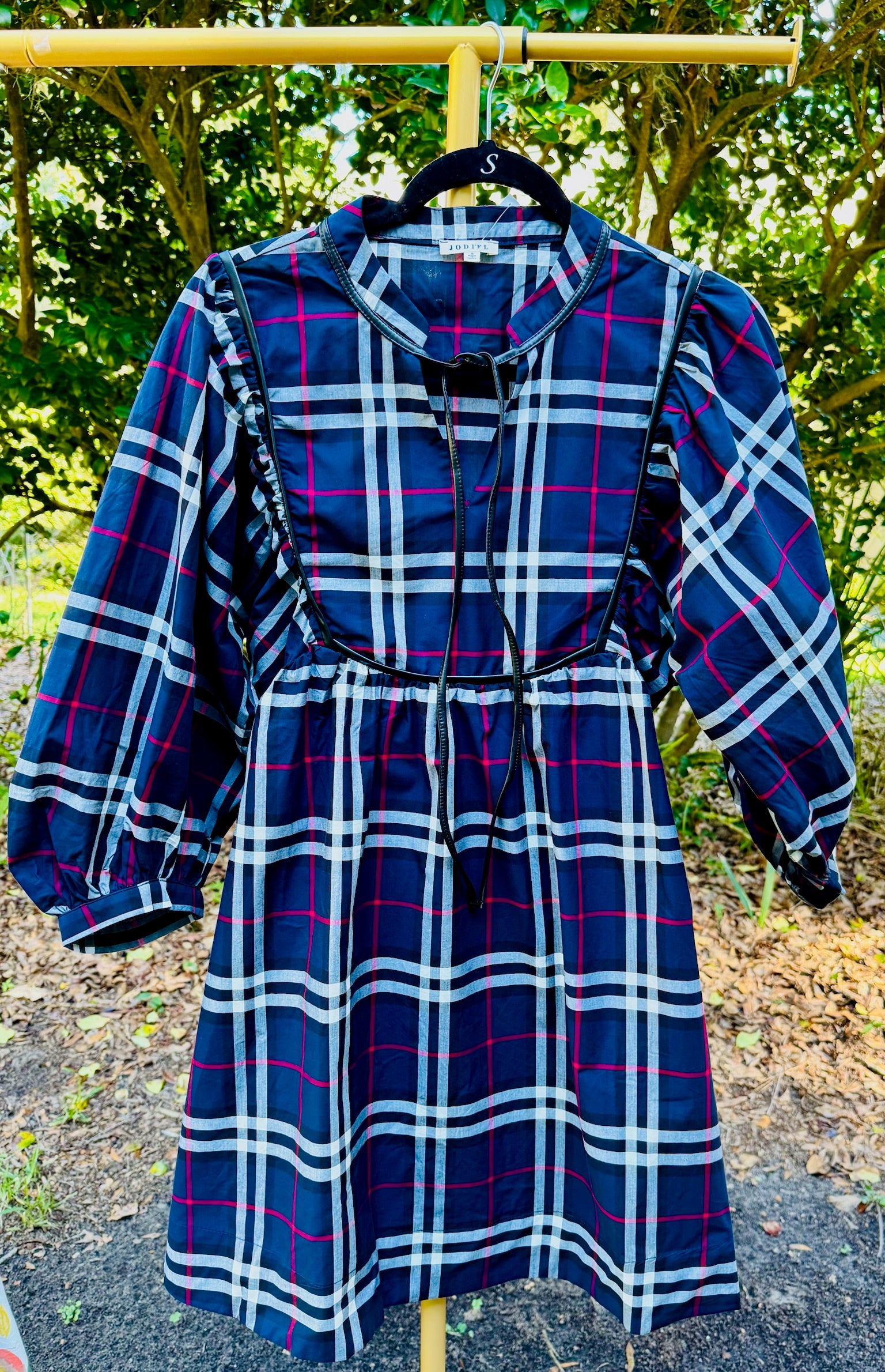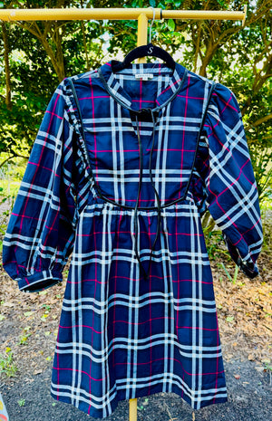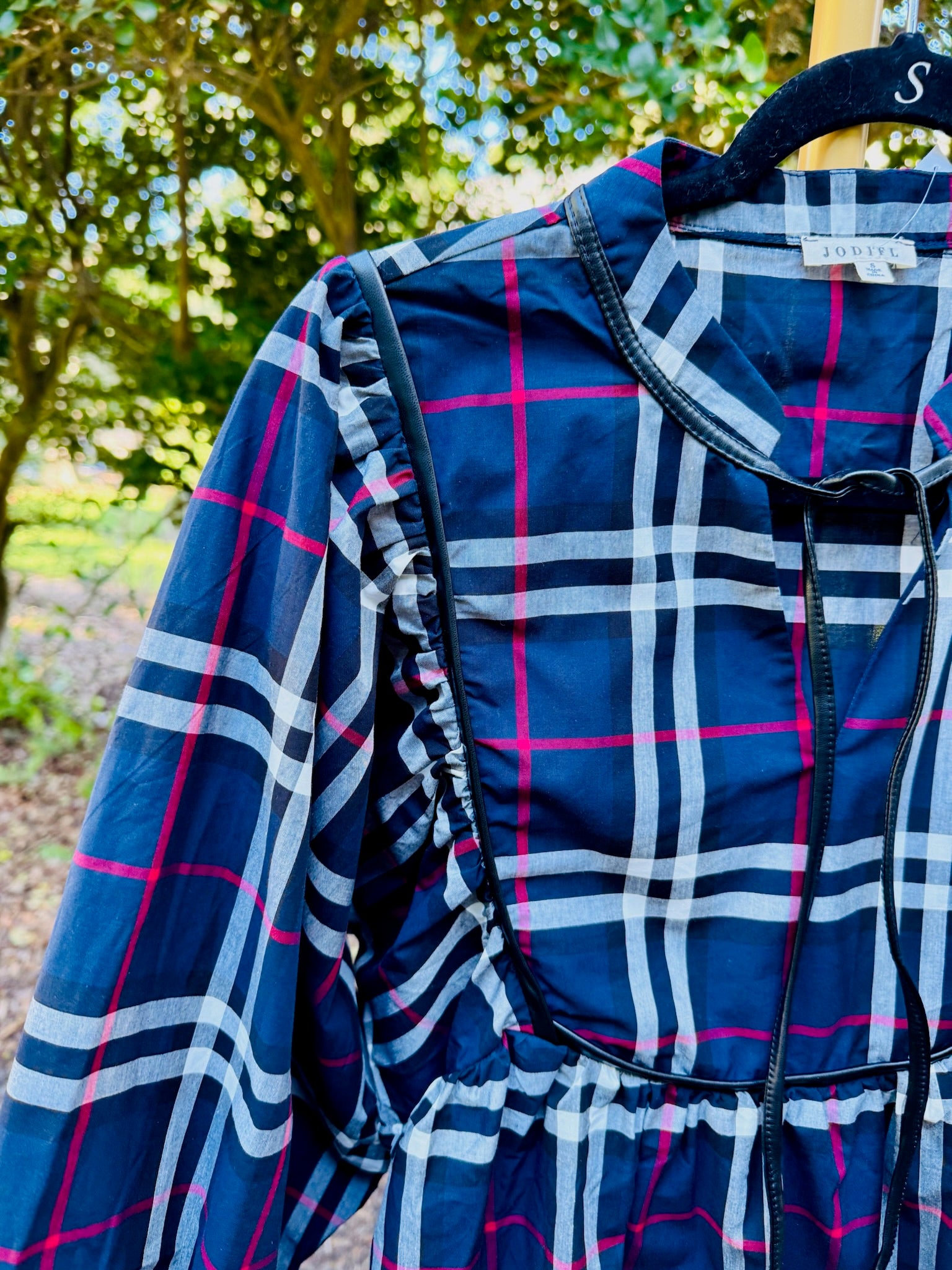 Add effortless charm to your everyday look with this 3/4 sleeve babydoll dress, crafted in a classic navy checker plaid. The Jen is designed with a flattering empire waist and a playful front tie detail. This dress blends feminine style with a touch of edge. Faux leather trim adds a modern contrast, giving the look a subtle hint of attitude. Side pockets add both style and convenience, making it as practical as it is pretty. Perfect for layering or wearing solo, this versatile piece works for brunch, casual outings, or laid-back office days.