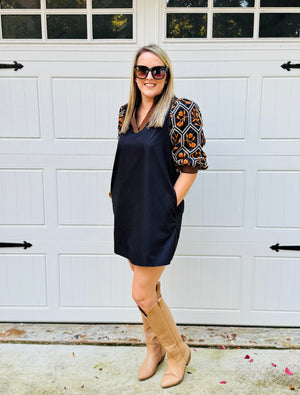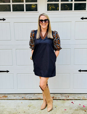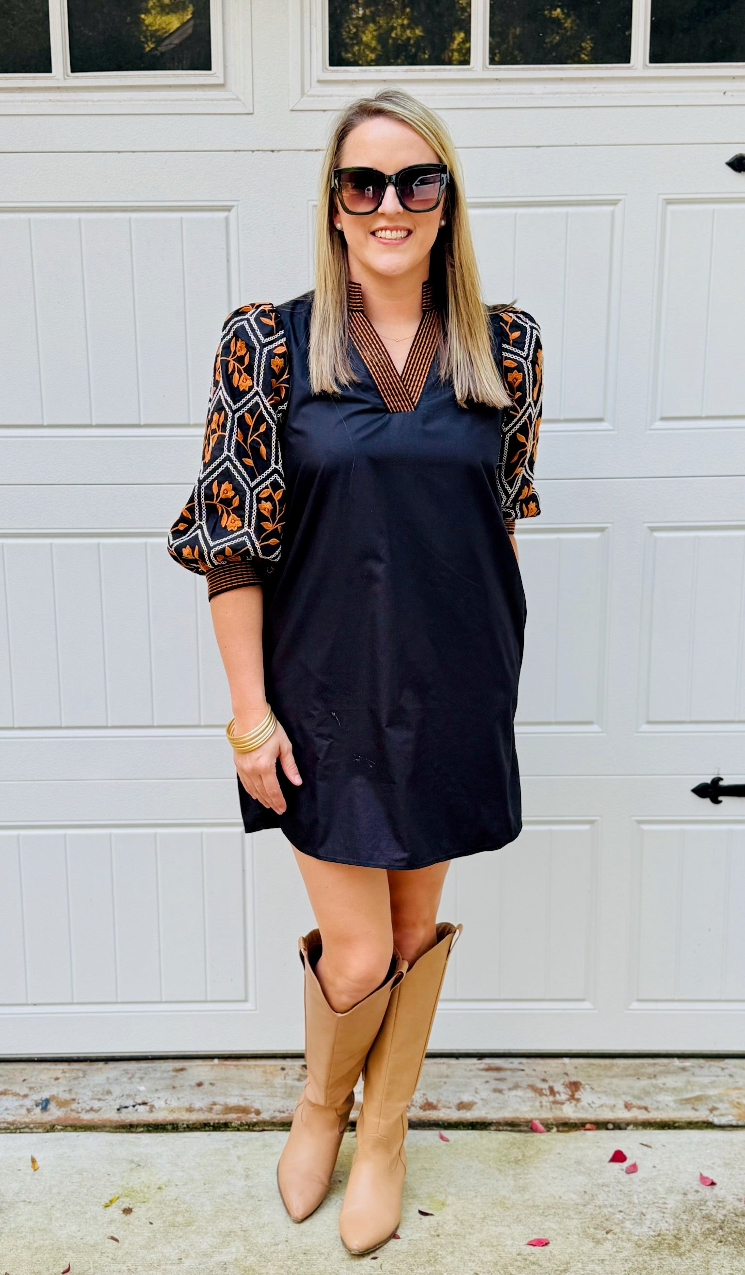 Make a statement in the Kennedy! This solid black mini dress, designed with elegant 3/4 sleeves crafted from textured jacquard fabric. The contrast knit neckline and cuffs add a modern touch, while intricate orange embroidery brings a vibrant pop of color and artistry. Finished with subtle stitch detailing at the collar and sleeve openings, this dress perfectly balances sophistication and creativity.