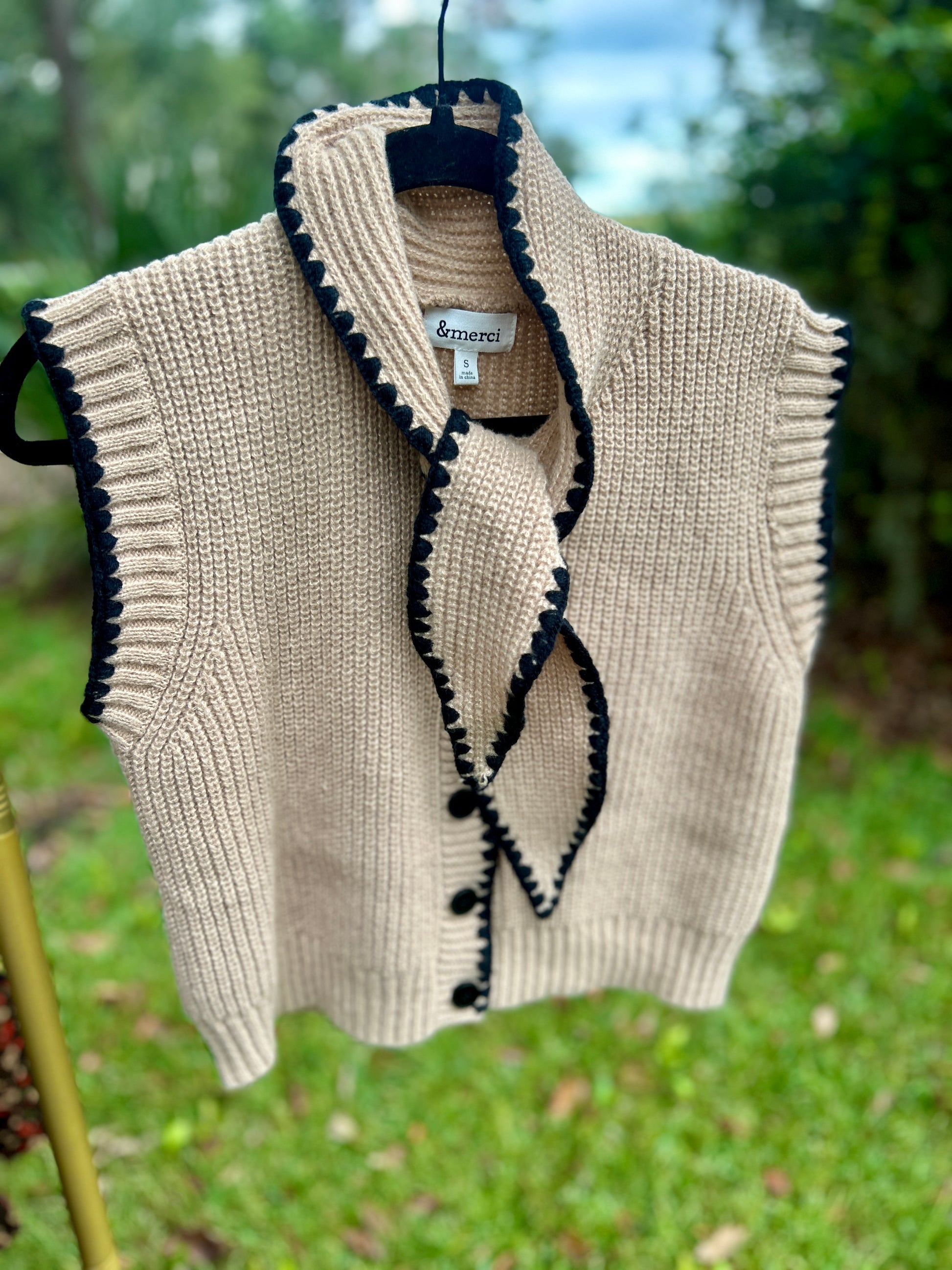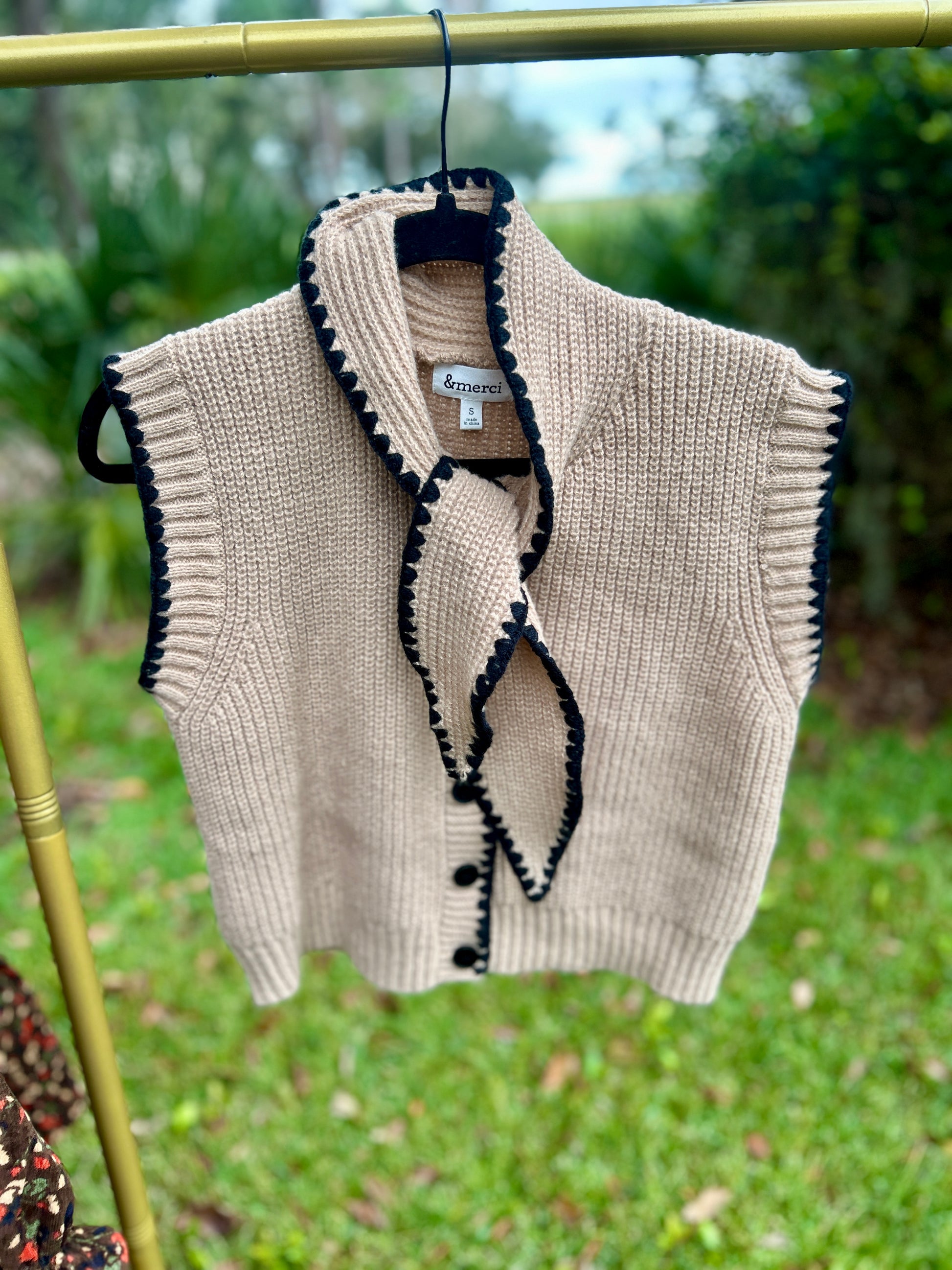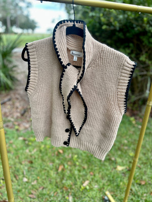 Elevate your layering game with this stylish tying neck sweater vest, designed for effortless versatility and a touch of bold detail. Crafted in a soft taupe knit, the vest features a relaxed bodice and a sleeveless silhouette, perfect for transitional dressing. A functional button-down placket adds structure, while the unique tying neckline offers customizable styling—wear it knotted, bowed, or left loose for a laid-back look.