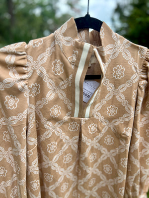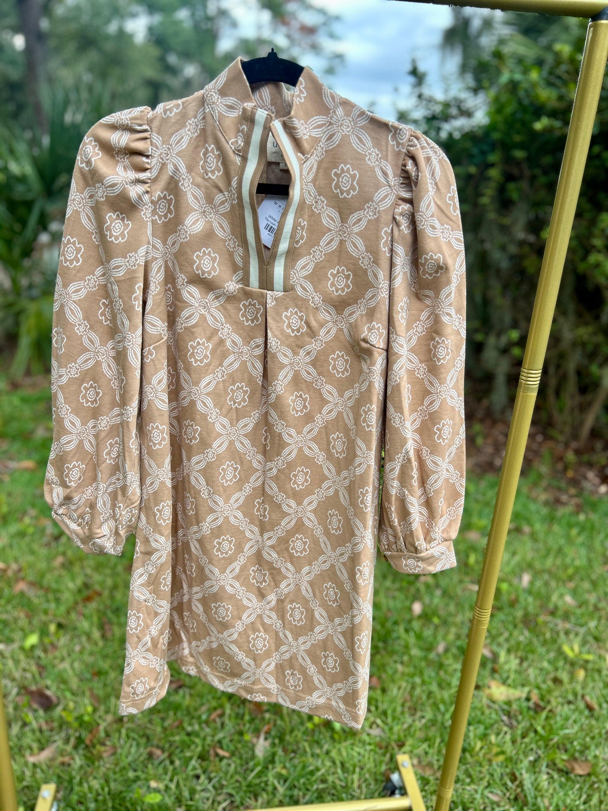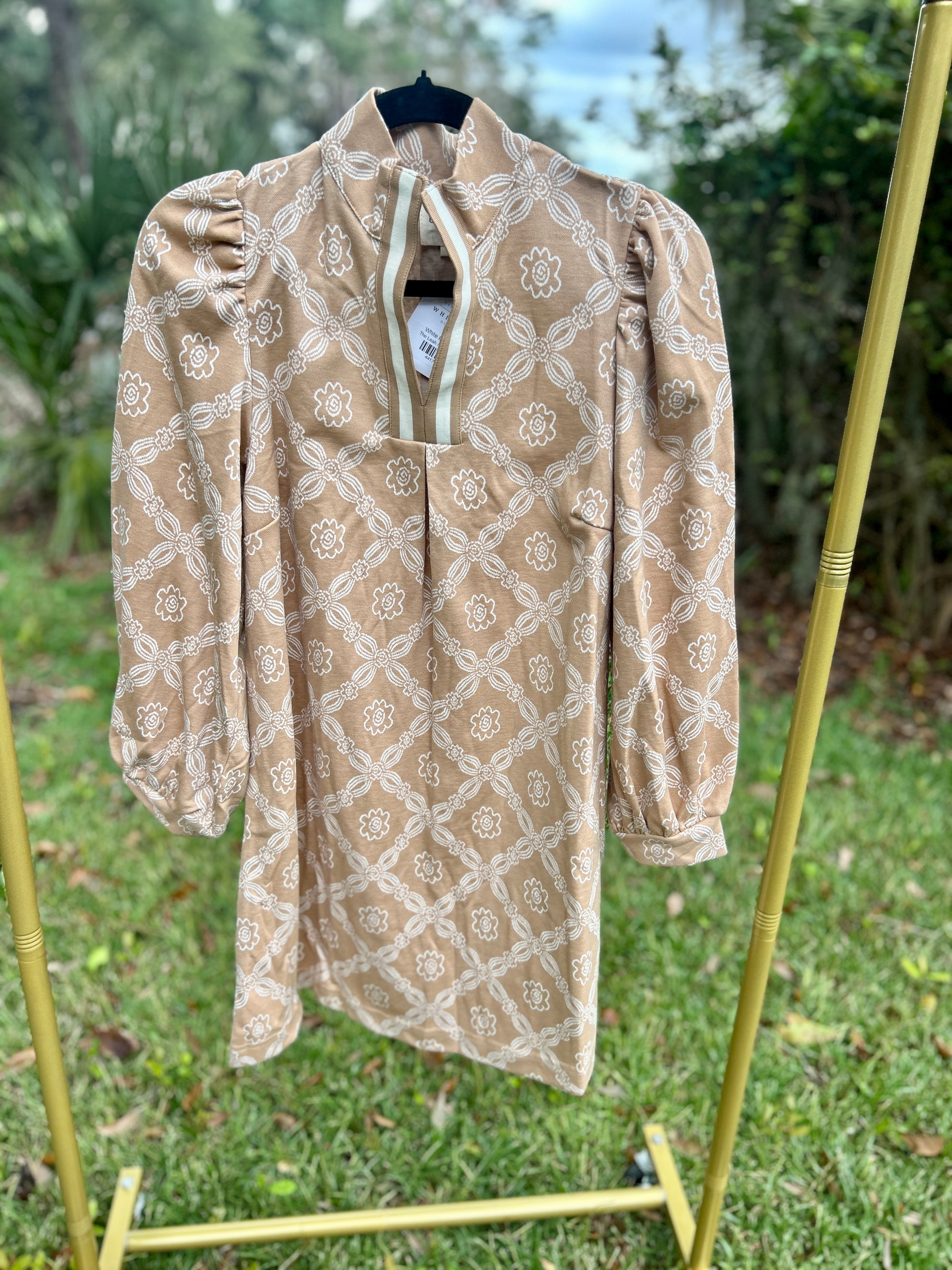 Elevate your wardrobe with this eye-catching geometric print mini dress, designed in a warm latte hue that flatters every skin tone. Crafted for both comfort and style, this dress features long sleeves and a subtly split neckline, adding a touch of allure while remaining effortlessly chic. Whether you're headed to brunch, a casual date, or a weekend outing, this dress offers an easy, elevated look with a bold, modern twist.