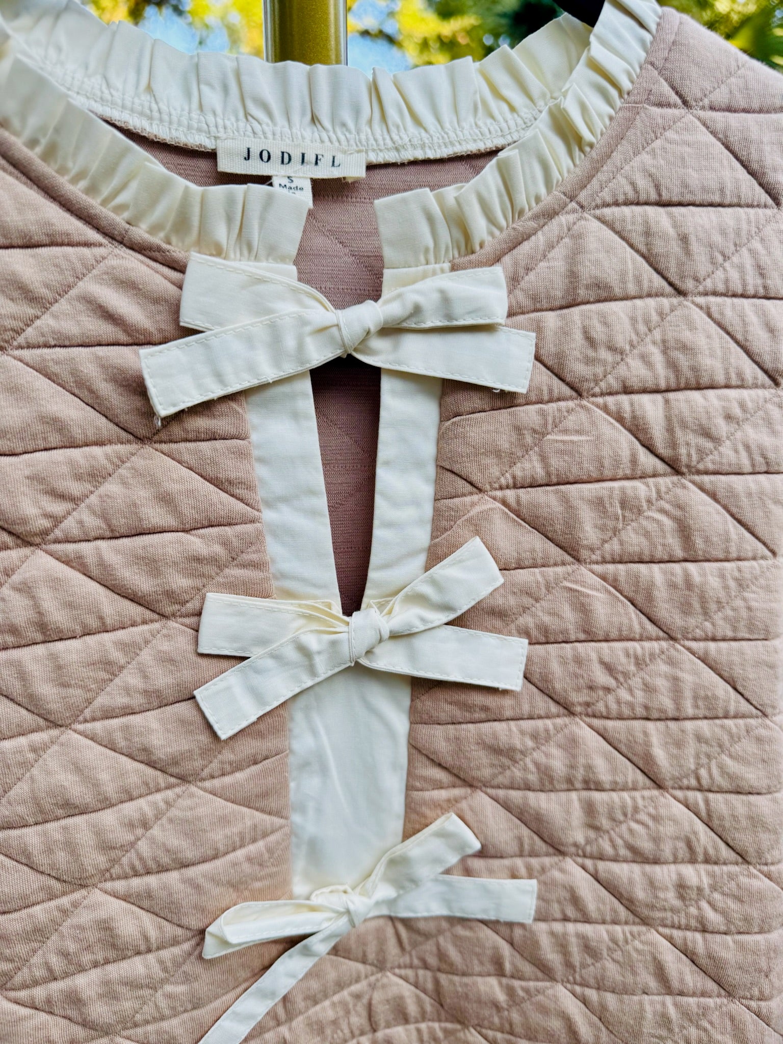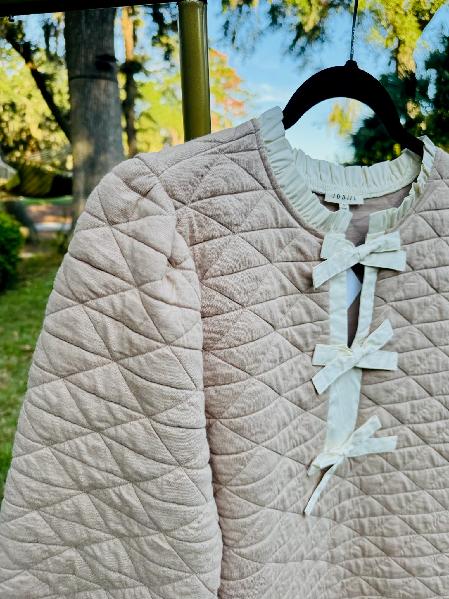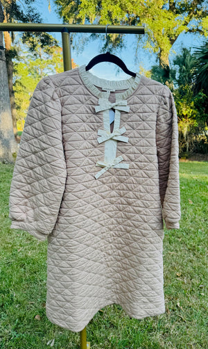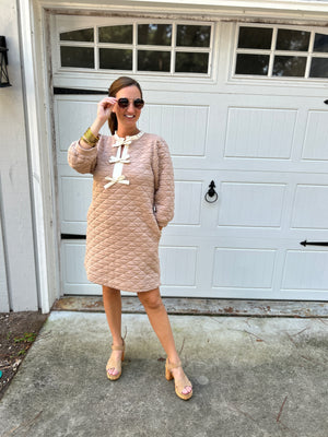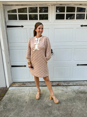 Elevate your everyday style with the Odette, a perfect blend of texture and feminine details. Crafted from a luxurious quilted fabric in a versatile taupe hue, this shift dress features elegant 3/4 sleeves and a charming ruffled neckline that frames your face beautifully. A delicate front bow tie accent adds a playful yet sophisticated touch, while practical side pockets keep essentials close at hand. Whether layered with boots or paired with sleek heels, the Sophie is your go-to for effortless chic.