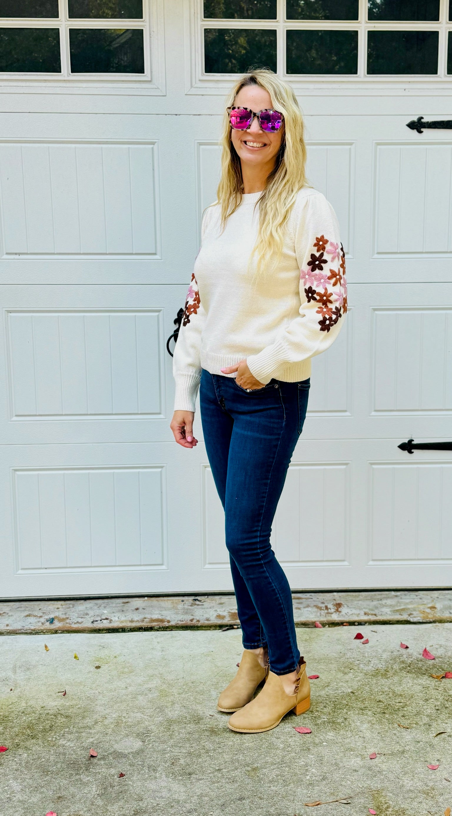 Add a touch of charm to your cool-weather wardrobe with this ivory sweater pullover, beautifully detailed with floral embroidered sleeves. The Skyler's soft knit fabric offers cozy comfort, while the delicate floral stitching brings a feminine, handcrafted feel. Designed with a relaxed fit and classic crew neckline, this sweater pairs effortlessly with your favorite jeans, skirts, or tailored trousers for a chic everyday look.