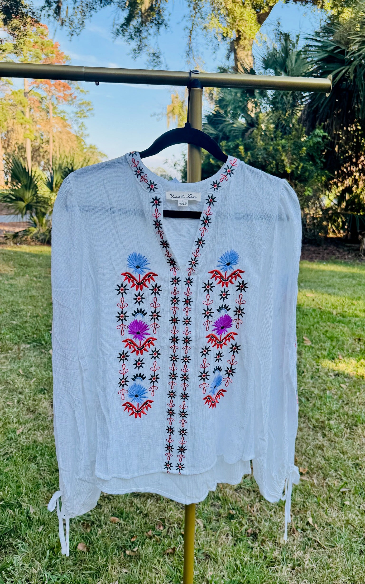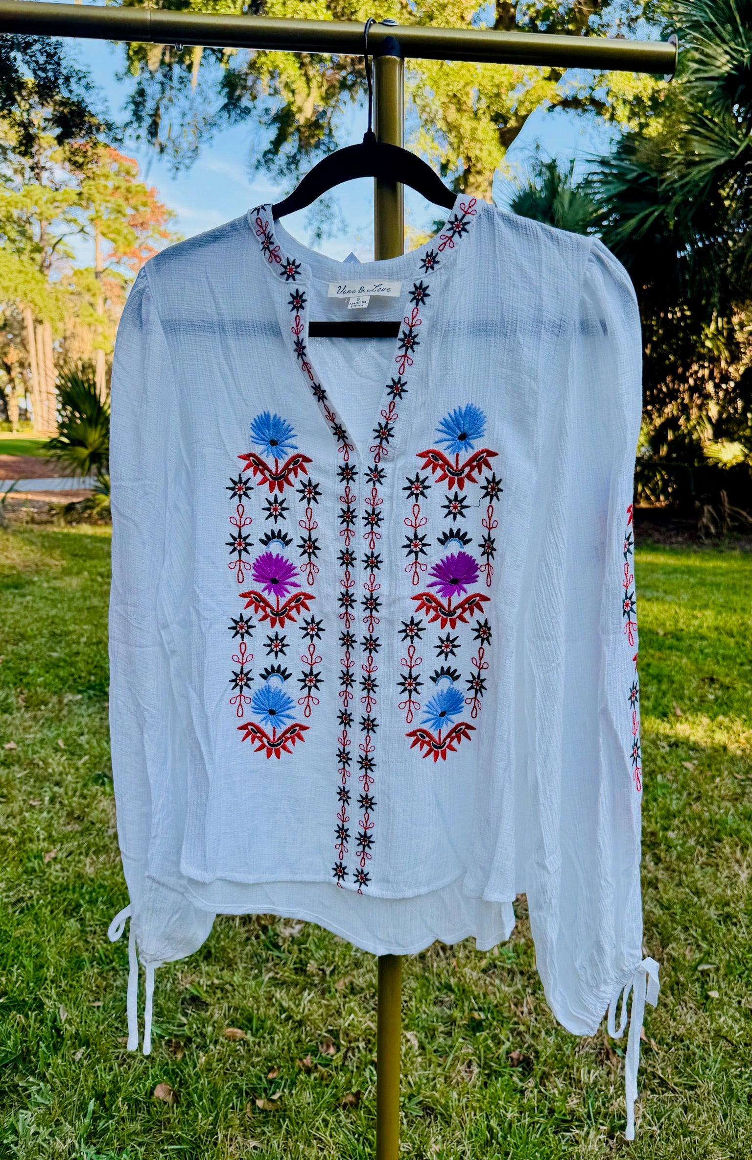 Softly structured with a playful touch, the Sophie is a white V-neck blouse brings effortless charm to any outfit. Featuring long puff sleeves and a relaxed silhouette, it’s elevated by intricate multicolor embroidery that celebrates warmth, heritage, and handcrafted detail — like a story stitched into fabric. Finished with gentle gathering at the cuffs for a hint of volume, it's equal parts timeless and full of personality.