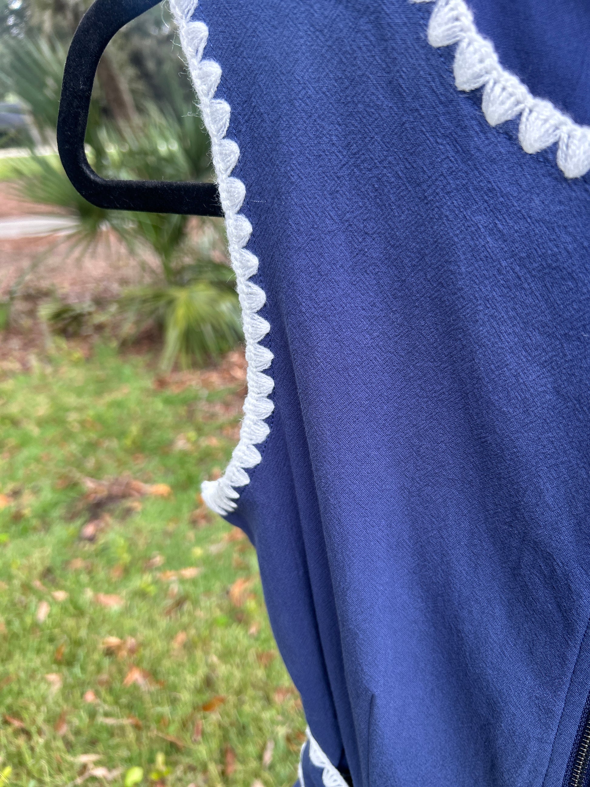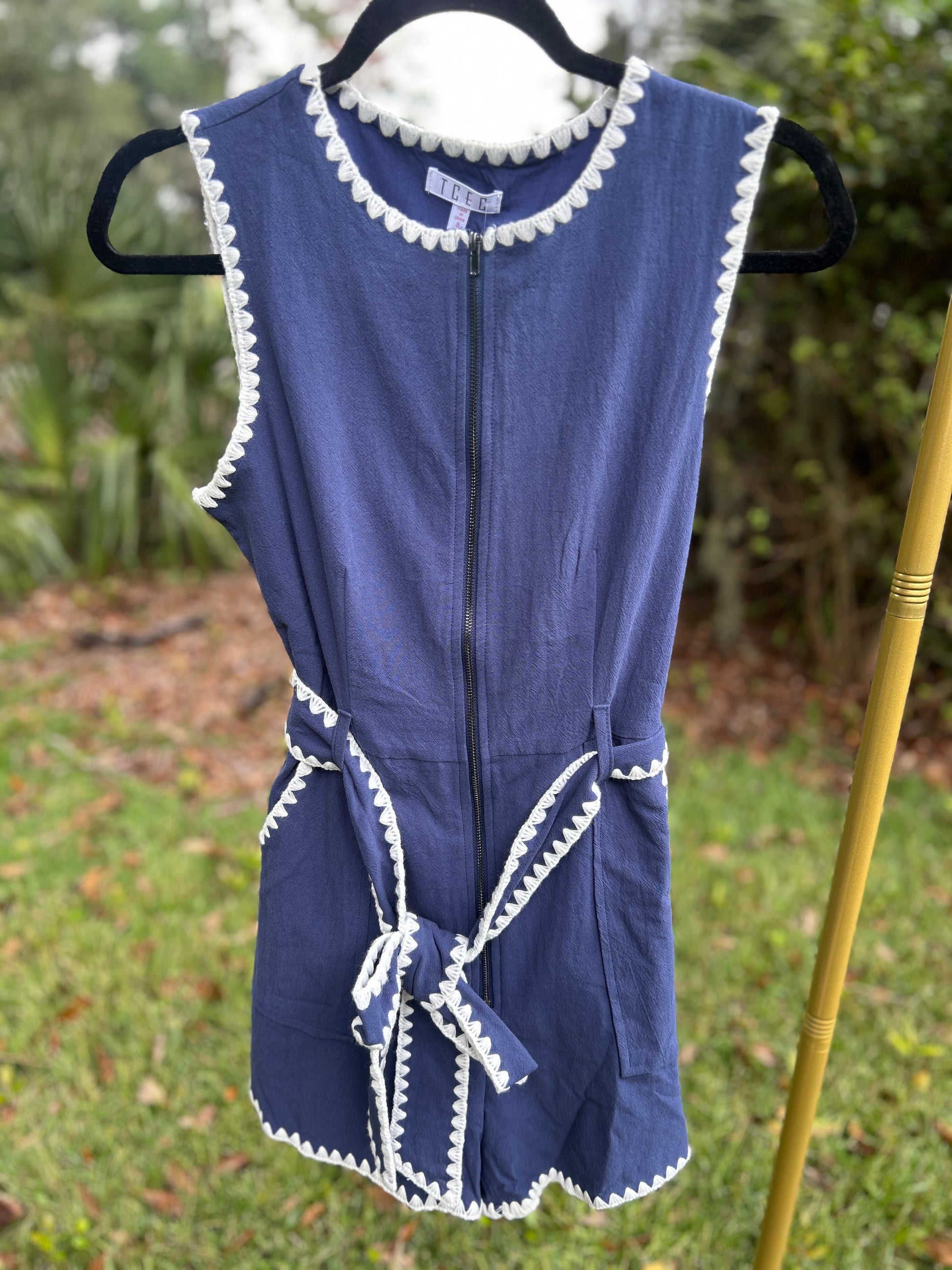 This navy romper combines functional design with subtle, stylish accents. The Sydney features intricate triangle embroidery stitch detailing and adds a refined touch to a classic silhouette. Designed with both side and back pockets for everyday convenience, a front zipper for easy wear, and an attachable belt to cinch the waist and define your shape. Whether you're on the go or dressing up for a casual outing, this romper brings together comfort, utility, and understated elegance.