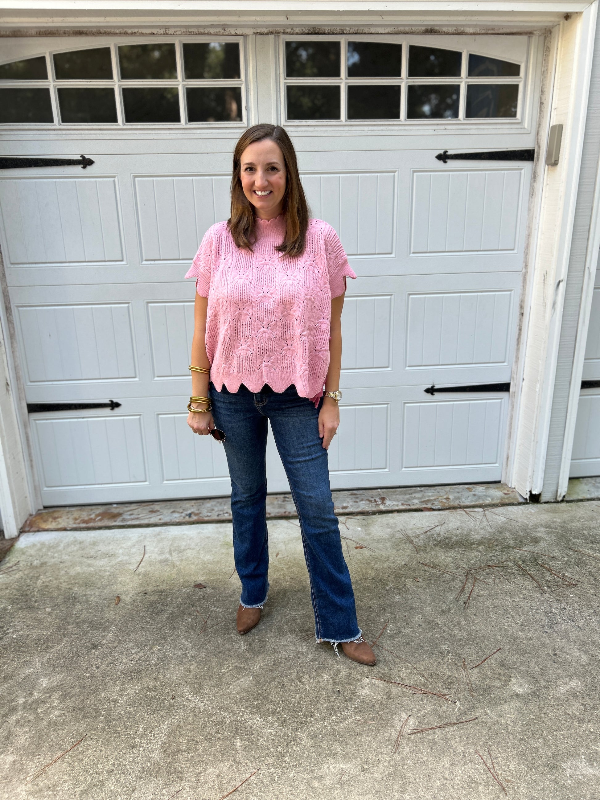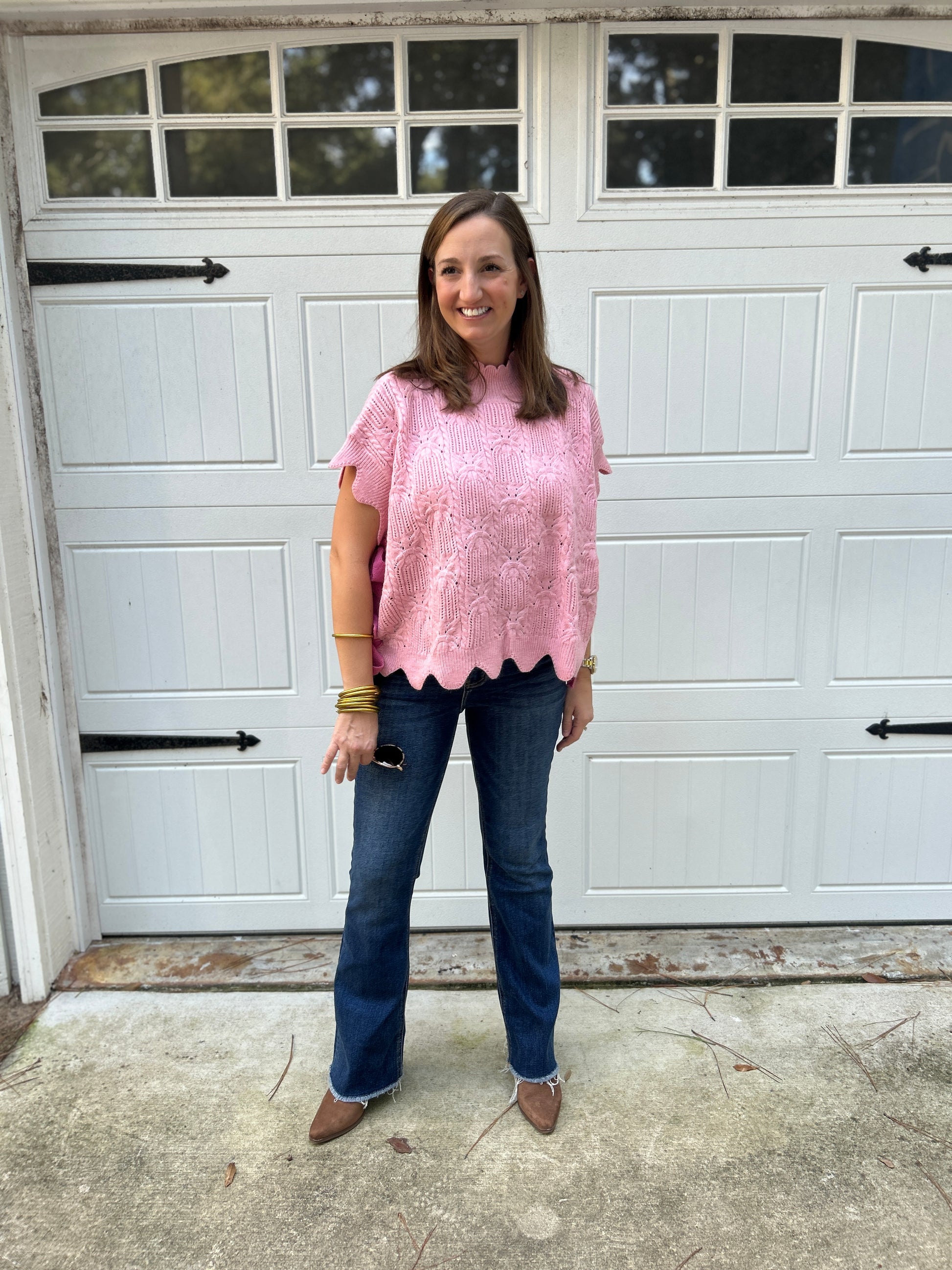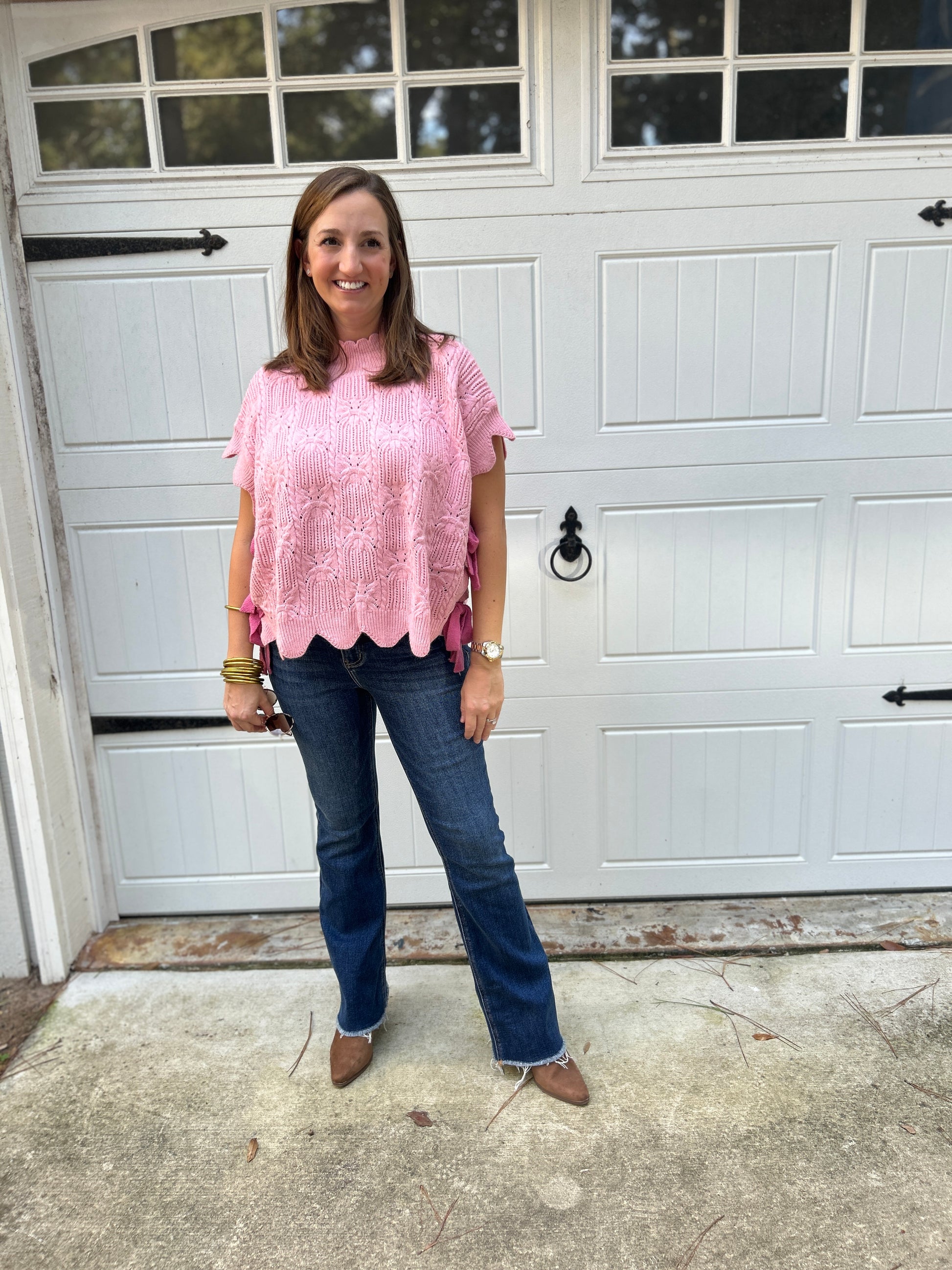 Soft with a statement, the Wren is a textured sweater vest that brings charm and versatility to any look. Designed in a warm pink hue with light pink contrast ties at the sides, it features delicate scallop edging and a cozy mock neck for an elevated touch. The side-tie detail adds a playful twist to the classic silhouette, making it perfect for layering or wearing it by itself. Equal parts sweet and stylish—this piece is made to stand out.